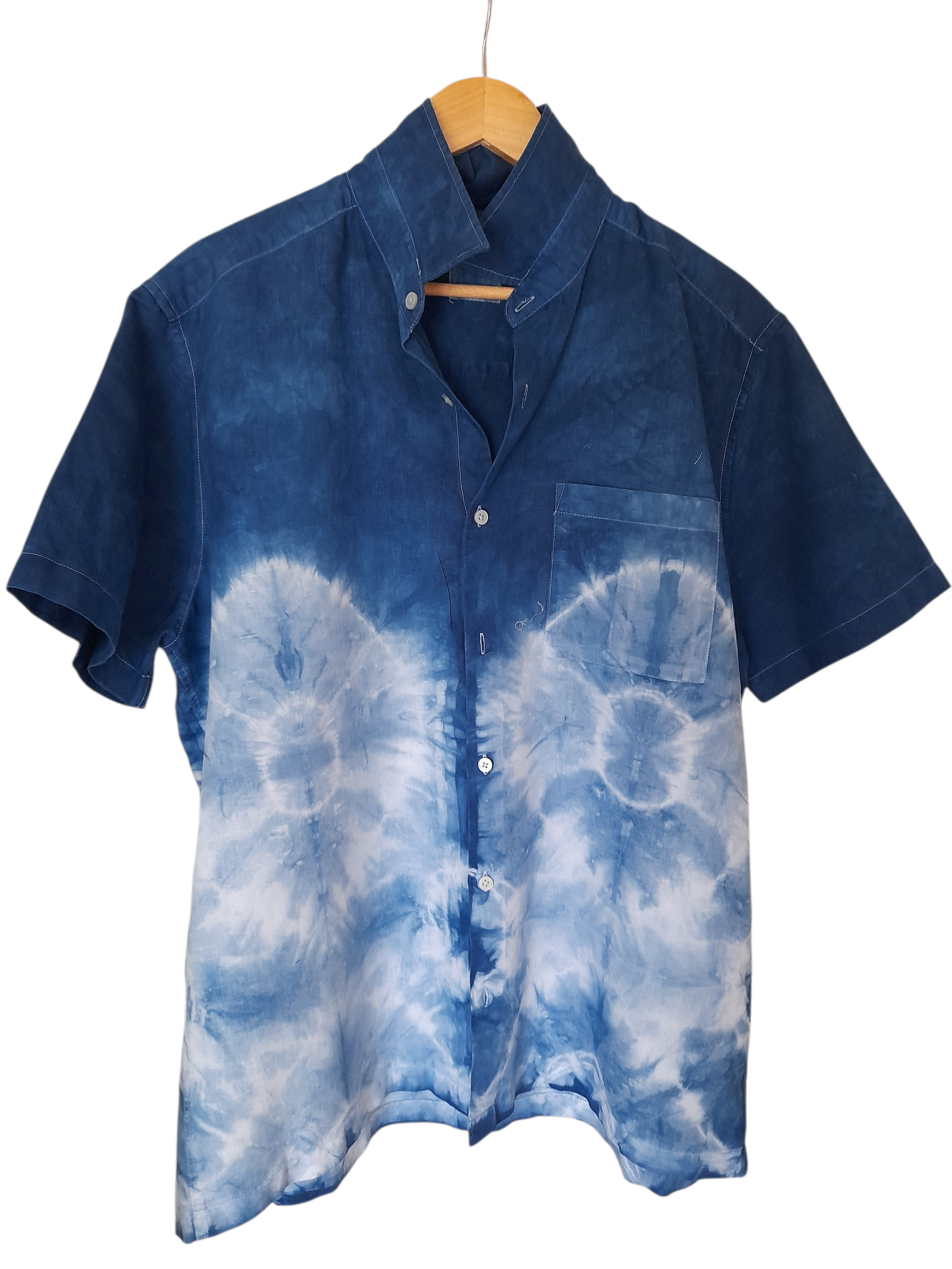 indigo dye, fold shibori pattern large size, short sleeves linen men's shirt. One off unique design and very classic understaded elegance